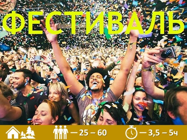 «Фестиваль» — направлен на принятие многообразия культур, развитие толерантности и инклюзивности. В ходе тимбилдинга команды созидают в нескольких направлениях (которые согласовываем с Заказчиком): танцы, архитектура, фото, рисунок, кухня…