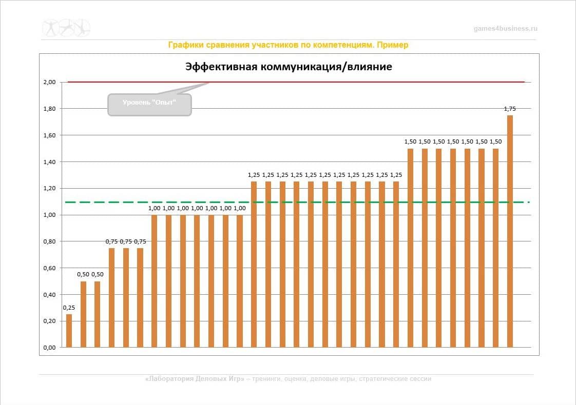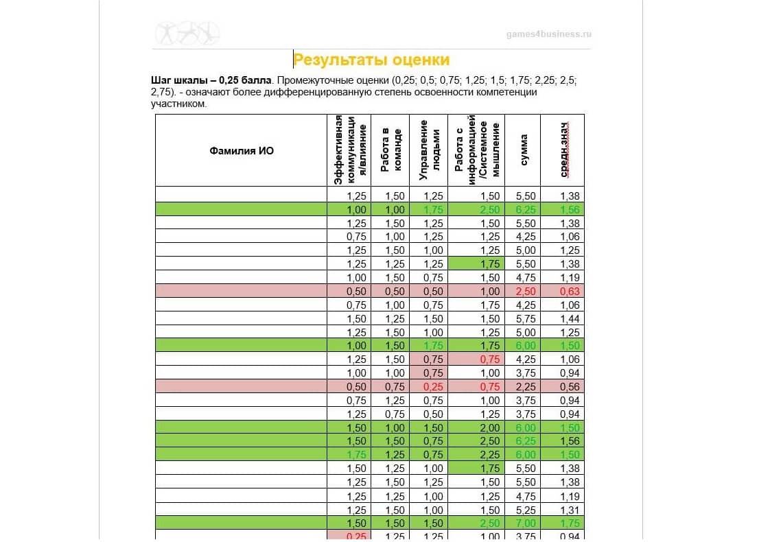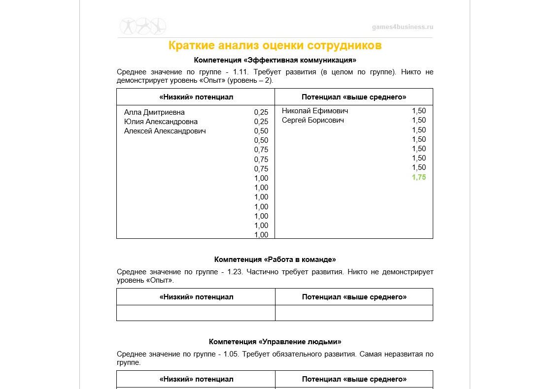Чаще всего результатом наблюдения за участниками деловой игры становится оценка в баллах по всем используемым критериям. По этим баллам строится рейтинг сотрудников: общий и по компетенциям. Возможны краткие комментарии по сотрудникам. Все это формирует контекст общего отчета, в который включается еще аналитика по группе в целом.