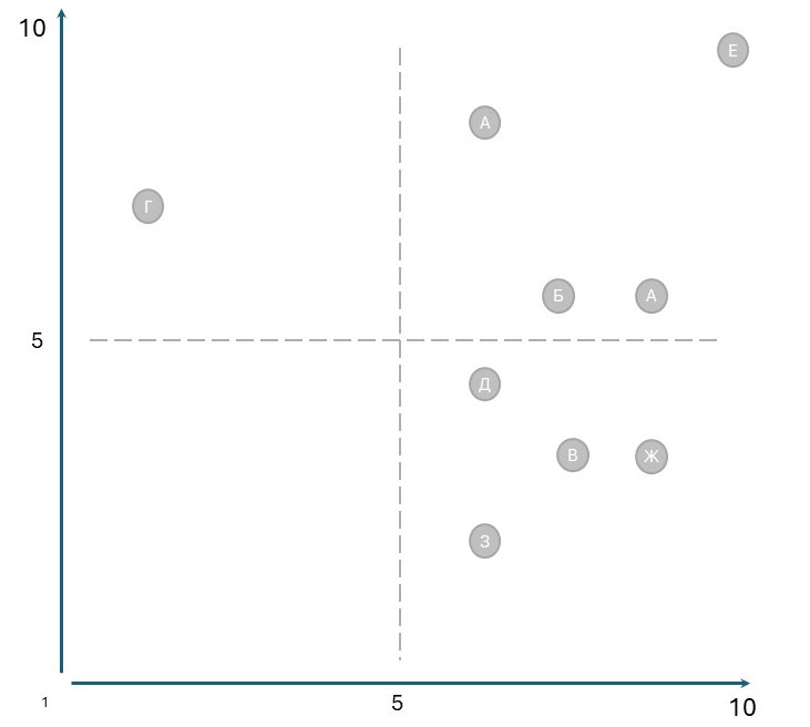 - Строим простой график или матрицу 10х10 из двух векторов: ось 0X – «срочность»; ось 0Y – «важность». Средние значения, понятно, будут посередине – 5. Это же и будем считать условной границей между квадрантами.