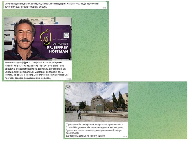 - Также мы разработали еще одну ветку (мы очень любим использовать этот вид заданий) — онлайн квест по Гугл. Картам, в котором участникам предстояло совершить виртуальную прогулку по улицам старого города в Иерусалиме с посещением нескольких достопримечательностей и святынь. И даже увидеть огромную ханукию, поставленную несколько лет назад на площади перед известной синагогой.