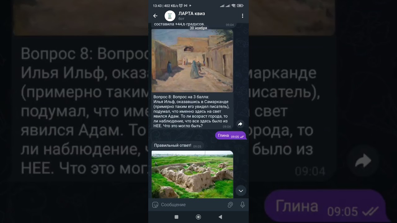 Мы не можем однозначно определить вид этой «интеллектуальной викторины», поскольку участники все 3 дня отвечали на вопросы, присылаемые Telegram-ботом. Но вопросы были и поискового характера — по историческим объектам Самарканда. Мы хорошо знаем и любим этот теплый и вкусный город! В комментариях мы рекомендовали участникам посещение интересных мест Самарканда, не охваченных «официальными» экскурсиями.