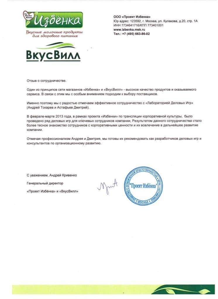 Один из принципов сети магазинов «Избенка» и «Вкусвилл» — высокое качество продуктов и оказываемого сервиса. В связи с этим мы с особым вниманием подходим к выбору поставщиков. Именно поэтому мы с радостью отмечаем эффективное сотрудничество с «Лабораторией Деловых Игр».