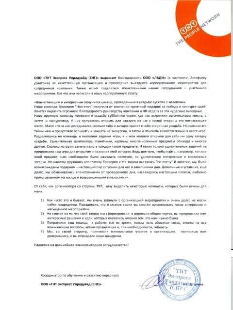ООО «ТНТ Экспресс Уорлдвайд (СНГ)» выражает ООО «Лади» (в частности, Астафьеву Дмитрию) за качественную организацию и проведение выездного корпоративного мероприятия для сотрудников компании…