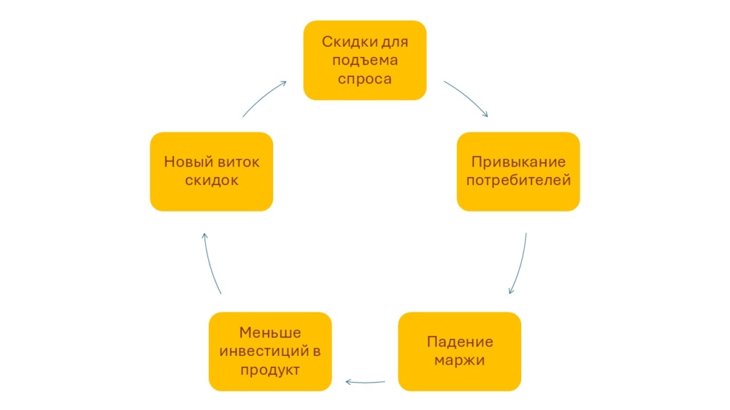 - Скидки для краткосрочного плана → привыкание клиентов к промо → падение маржи → меньше инвестиций в продукт → новый виток скидок.