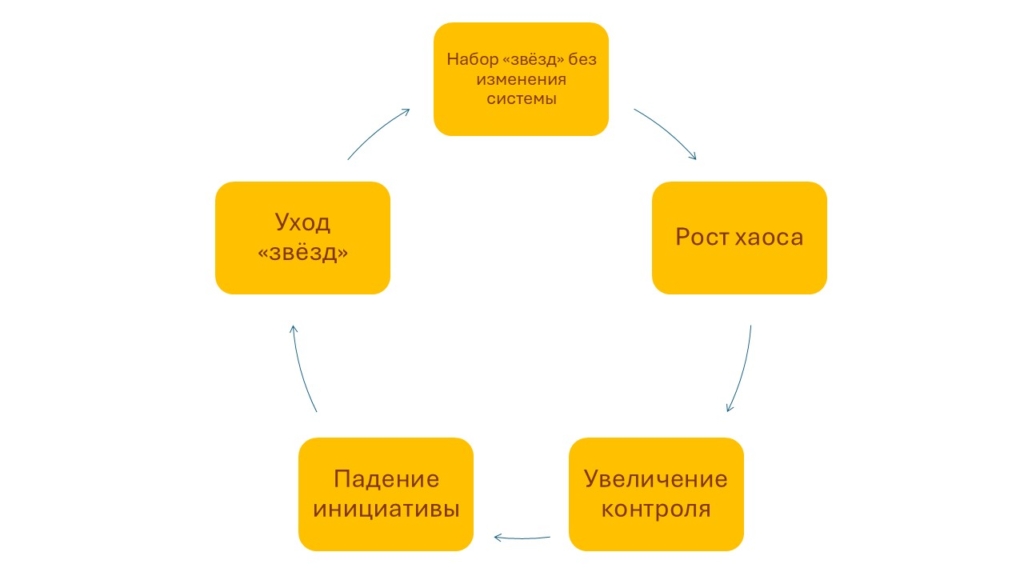 - Набор «сотрудников-звёзд» без изменения процессов → рост хаоса → больше контроля → падение инициативы → уход «звёзд».