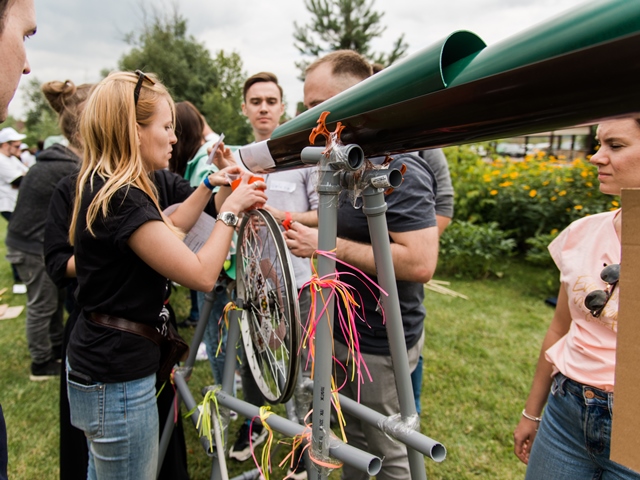 Наиболее популярная последние 5 лет программа для летнего корпоратива, которая является прекрасной метафорой работы компании, как взаимосвязи отдельных функций и процессов. Суть — из предложенных материалов команды должны построить единую конструкцию, передающую энергию по принципу цепной реакции. Здесь проявляется креативность и умение участников согласовывать свои действия.