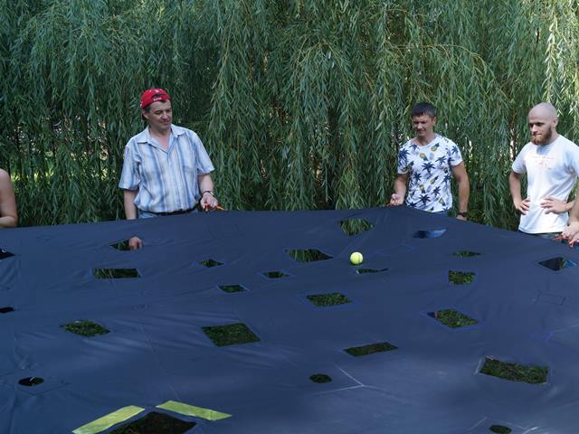 Участники держат полотнище с отверстиями и должны “провести” теннисный мяч по определенному маршруту.