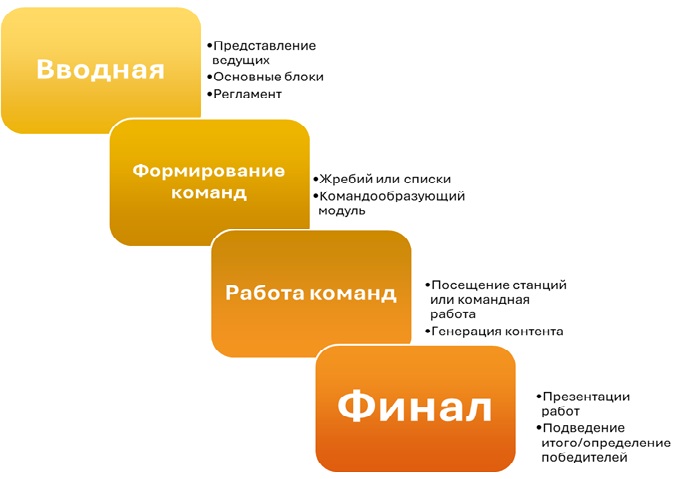 - Формирование команд и модуль на знакомство (зависит от задач и особенностей корпоратива).