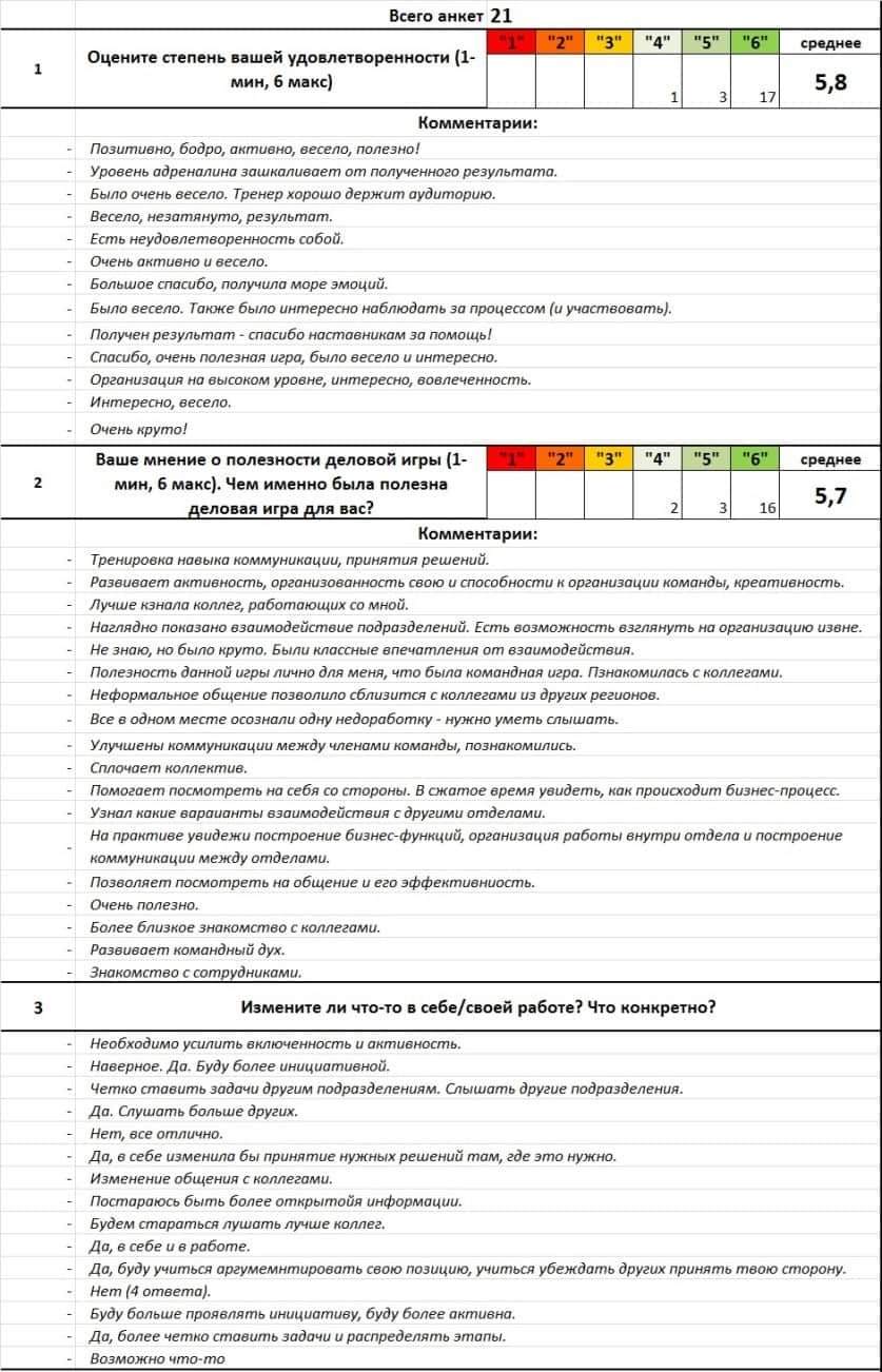 • Результат: Определили важность работы на общую цель и коммуникаций. Сформулировали "ценности" коммуникаций. Определили необходимость корретировки регламента взаимодействия.