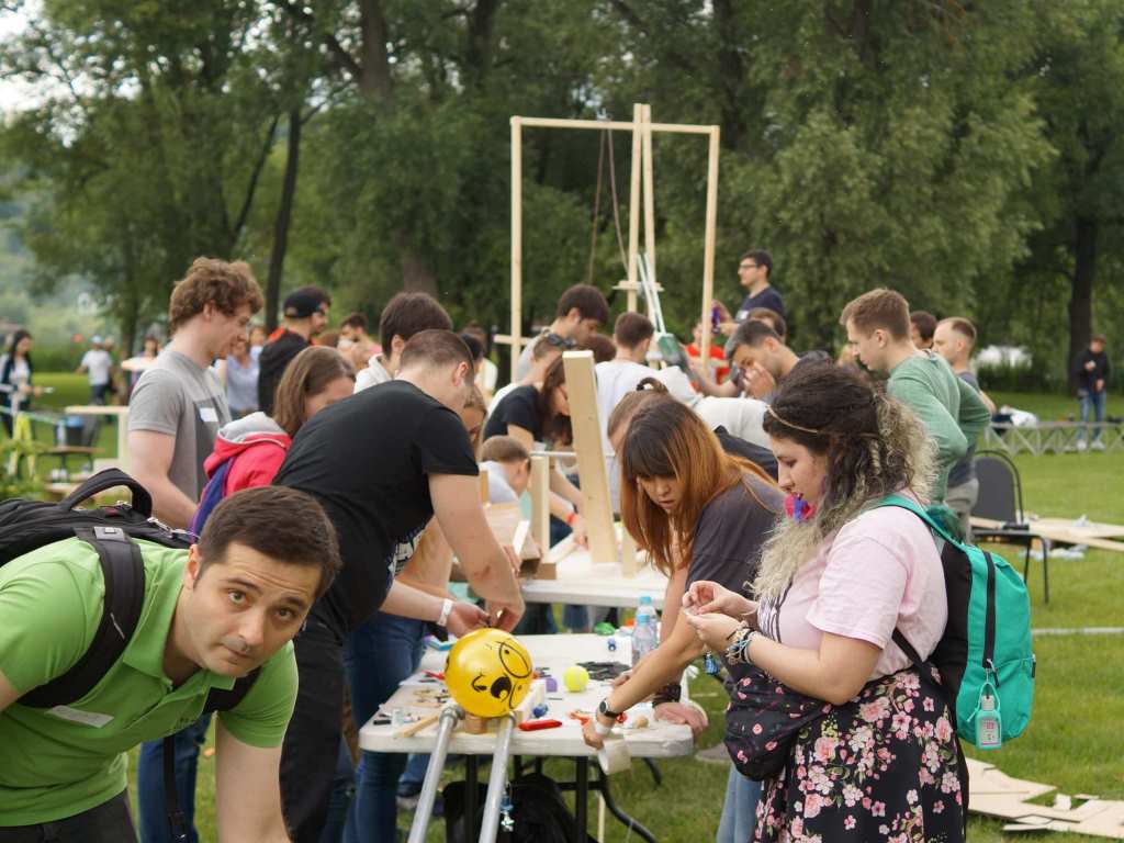 С неизменным успехом мы проводим этот тимбилдинг для коллективов от 20 до 400 участников (средняя численность - 80-120 человек). По нашим подсчетам каждый год "машину Голдберга" с нами строят от 300 до 800 сотрудников разных компаний и организаций.