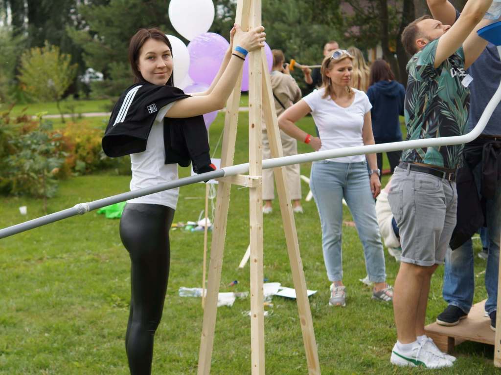 Также, использование «открытого набора» материалов (помимо инструментов и уникальных аксессуаров и игрушек, мы буквально привозим грузовик стройматериалов, покрышек, палет, бочек…), что позволяет участникам проявлять свою креативность, а не просто собирать готовую конструкцию.